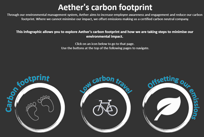 This infographic visualises Aether's most recent carbon footprint. It shows our company's emissions, broken down by source, and demonstrates how we are trying to minimise our impact through our SME Climate Hub commitment and offsetting our greenhouse gas emissions.