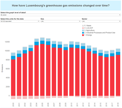 This viewer presents Luxembourg's greenhouse gas and air pollutant emissions in the past, present and future. It also provides information on policies and measures and the potential wider impacts of climate action. This analysis will be updated for the preparation of policies and measures for the updated integrated NECP required in 2023.